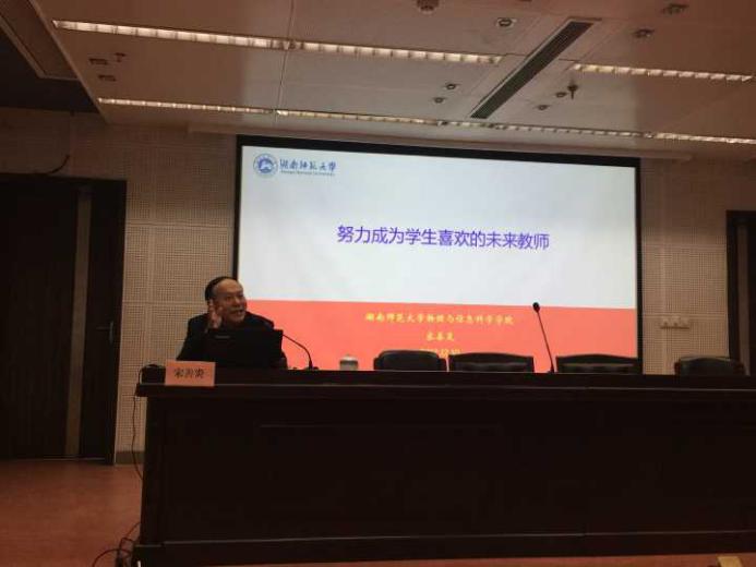 宋善炎教授用自下而上的视角,阐释了如何“努力成为学生喜欢的未来教师”。宋善炎教授以一个数学问题引入,告诫同学们勤学的重要性;紧接着就“不忘初心,努力学习、努力成为学生喜欢的老师”为切入点,向与会的研究生提出了中肯的建议,并鼓励同学们只要秉承初心,不断学习思考与实践,一定能提升能力,成为学生喜欢的未来教师。