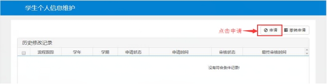 2. 进入学生信息维护界面之后点击“申请”按钮;
