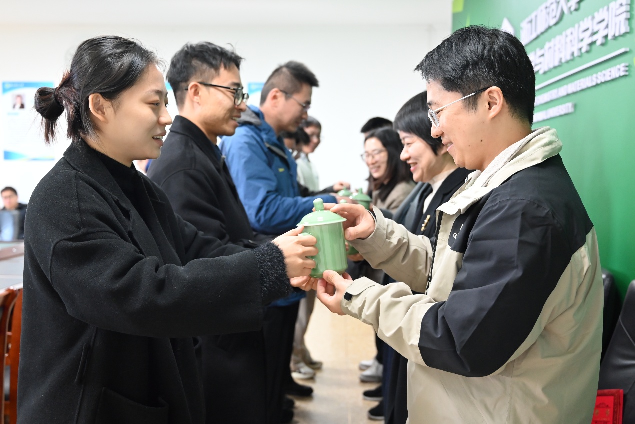 副院长乔儒宣读结对名单,院长李正全和副院长乔儒为导师们颁发聘书。随后,新教师们双手捧上热茶,以茶敬师,表达对结对导师的敬意和感谢。导师们则向新教师回赠学习资料,希望新老师们多学习、多钻研。