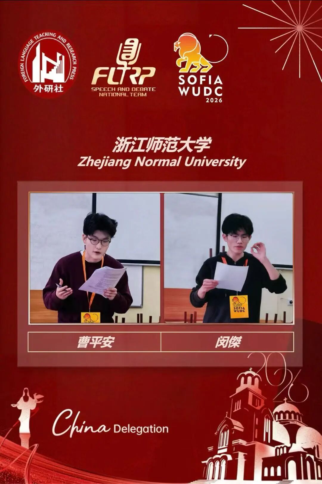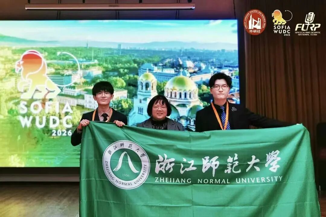 2025年12月27日至2026年1月4日,2026世界大学生英语辩论锦标赛(简称世辩赛,World Universities Debating Championship,WUDC)在保加利亚国家与世界经济大学(University of National and World Economy,UNWE)举行。浙师大英语(师范)专业学生曹平安和化学(师范)专业学生闵傑组队代表浙师大随中国代表团参赛,完成了浙师学子在国际辩论舞台上的首秀。浙师大外国语学院朱玲佳老师作为指导老师应邀带队、指导。